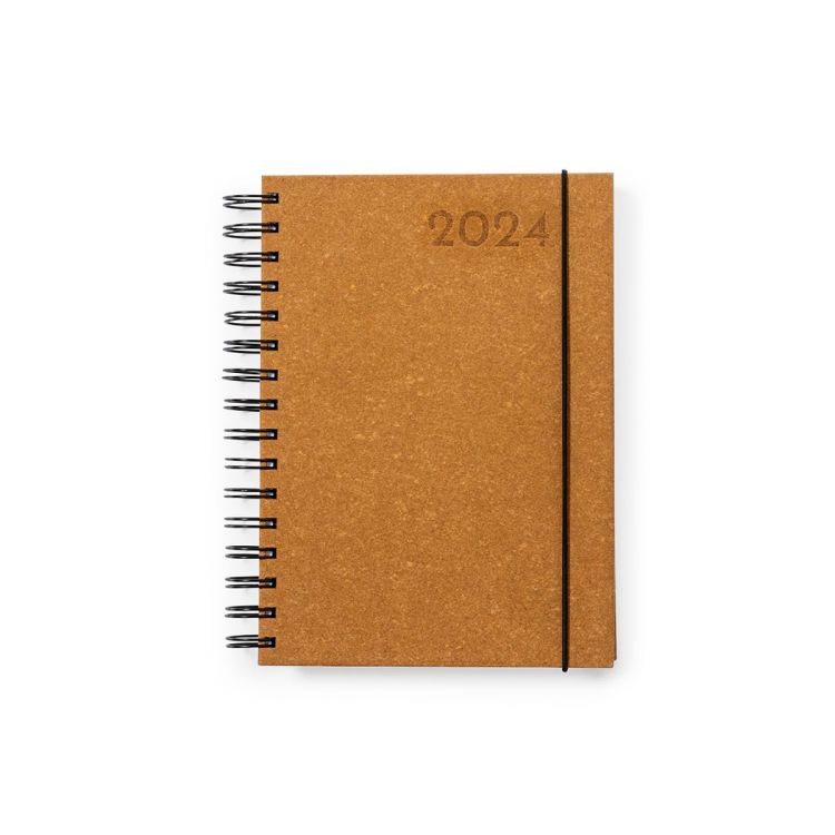 Agenda in formato A5 realizzata in pelle riciclata elegante e sostenibile. Con copertina rigida e chiusura elastica. Con logo pelle riciclata.Design della pagina giornaliero, area per le note quotidiane e pagine con angolo fustellato per segnare il giorno. In 2 lingue: spagnolo e inglese. Presentato in una scatola kraft. La pelle riciclata recupera le fibre scartate nei processi di produzione della pelle, riducendo al minimo lo spreco di materiale, contribuendo a ridurre l'impatto ambientale e mantenendo allo stesso tempo le sue proprietà originali. (colore naturale)