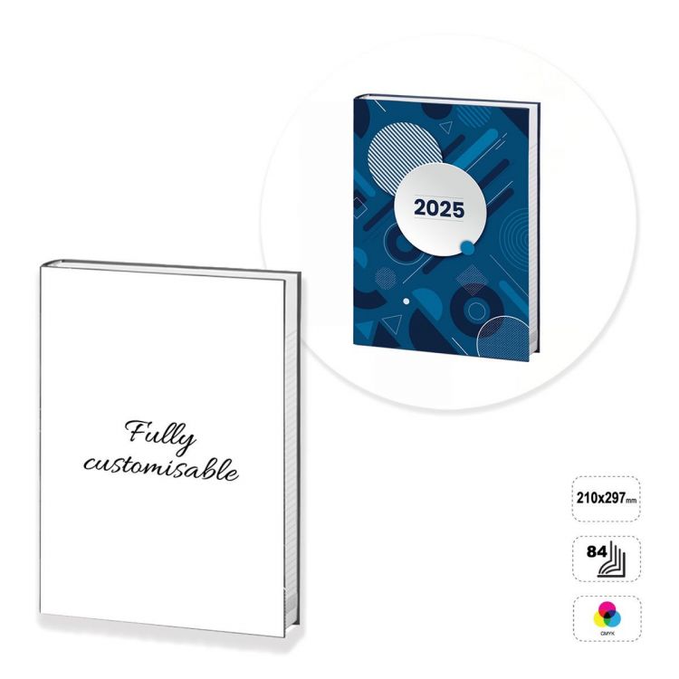 Agenda settimanale totalmente personalizzabile. Il prodotto è composto da 84 pagine (compresa la copertina) di carta usomano da 90 grammi, stampabili ad 1 colore (nero), e la copertina in cartoncino da 300 grammi con la finitura pattinata lucida stampabili fronte o fronte e retro in quadricromia. Disponibile la plastificazione sul fronte a scelta tra lucida, opaca o soft touch. Il prodotto è realizzato con l'allestimento in brossura fresata, una particolare lavorazione che consiste nel "fresare" le pagine incollate insieme sul dorso, per far penetrare maggiormente la colla che le tiene unite e rendere il prodotto molto resistente. L'agenda può essere personalizzata basandosi sul template modificabile fornito, oppure costruita completamente seguendo le linee guida fornite.