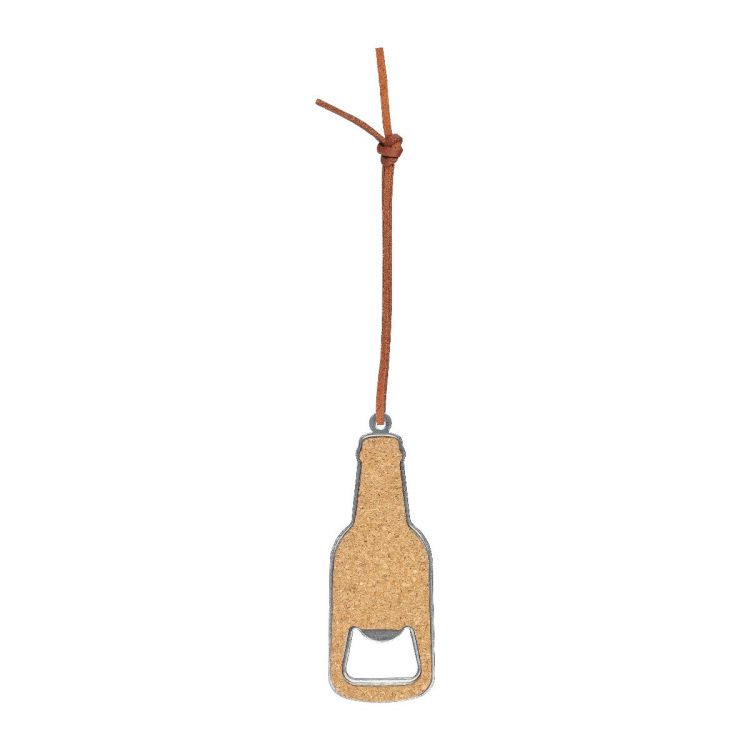 Apribottiglie in sughero con dettagli in acciaio inox e sughero su entrambi i lati. Include un cordino in PU. Confezionato singolarmente in una custodia di carta marrone, in colore marrone