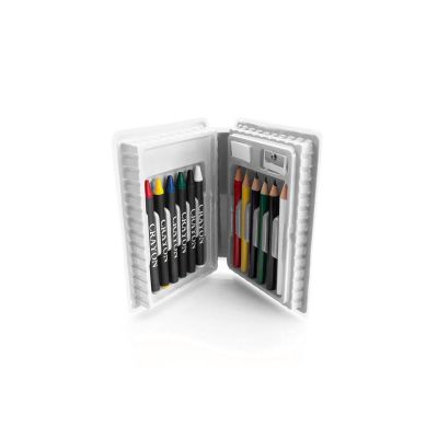 AstuccioSet composto da 14 pezzi in un robusto astuccio in colori vivaci e interno con scomparti di sicurezza. Contiene gomme, temperamatite, pastelli e matite di legno con corpo cilindrico in diversi colori.