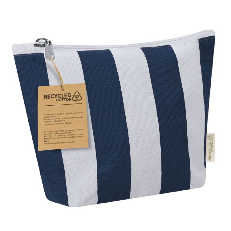 Astuccio realizzato principalmente in cotone riciclato 220 g/m², con elegante design a righe verticali. Scomparto principale con chiusura a cerniera. Include etichetta esterna con logo cotone riciclato.