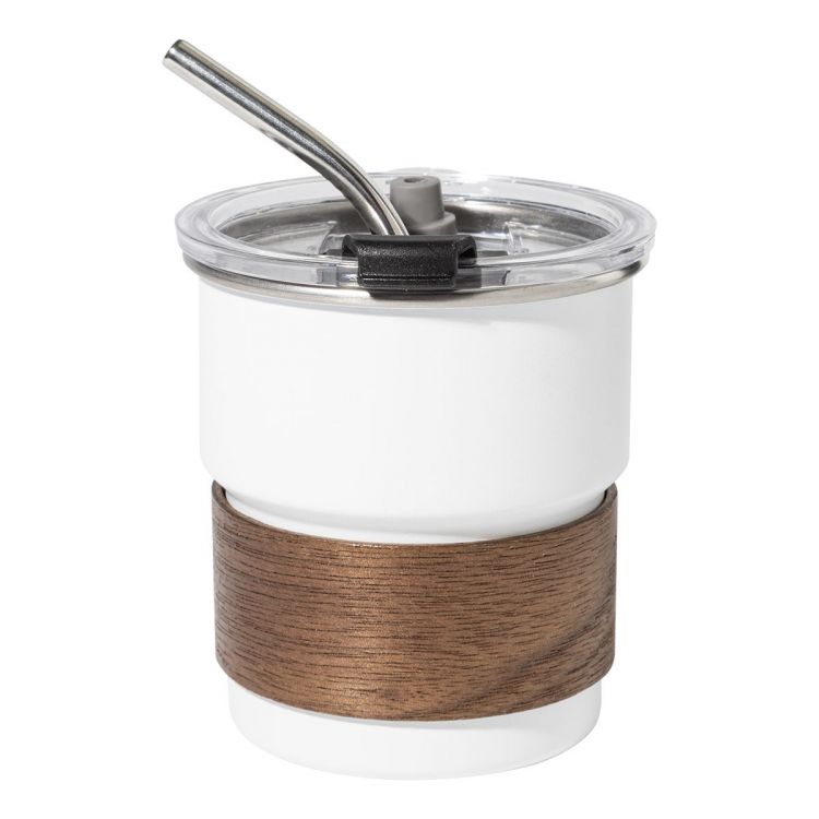 Bicchiere in acciaio riciclato a parete singola da 260ml con presa in legno di noce, coperchio in plastica e cannuccia in acciaio riciclato.
