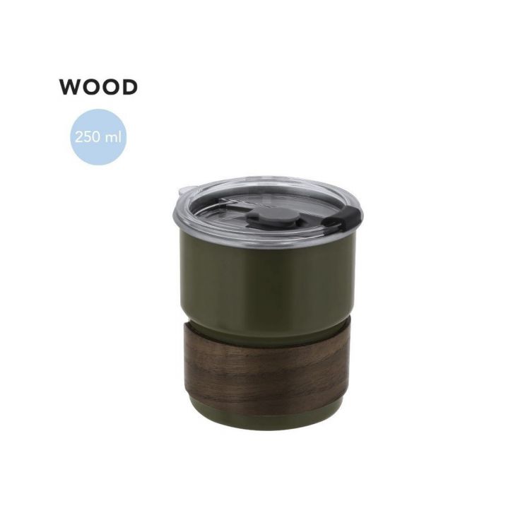 Bicchiere realizzato in acciaio inox e sofisticato legno. Con capacità di 250 ml. Include elegante fascia in legno. Include coperchio trasparente ermetico con dosatore nella parte superiore e foro per cannucce, privo di BPA.