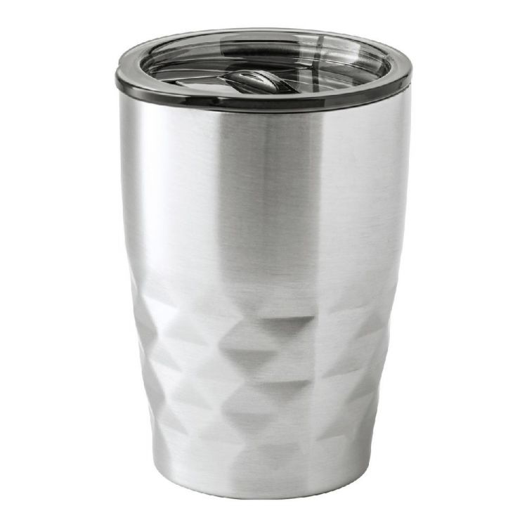 Bicchiere termico da 350ml. in acciaio a doppia parete con tappo erogatore in plastica ed isolamento in rame che permette di mantenere il contenuto caldo per 12 ore e freddo per 24 ore.
