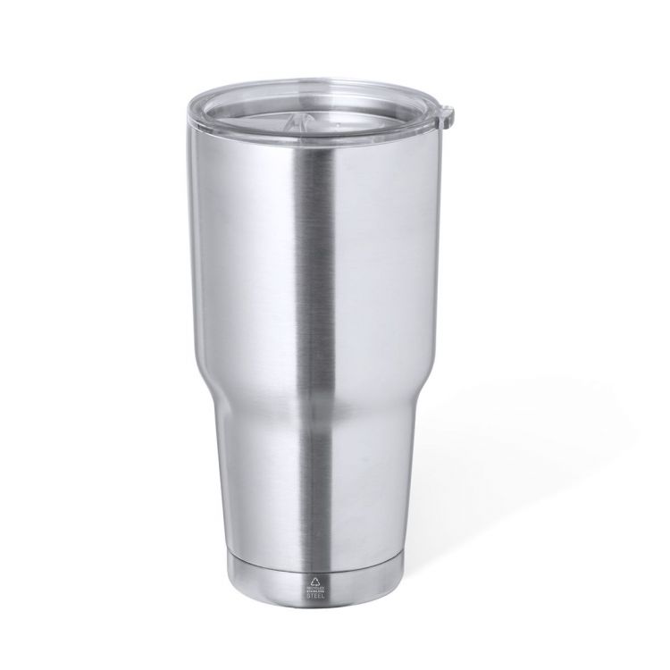 Bicchiere termico da tavolo in acciaio inox riciclato a doppia parete con capacità di 800 ml. Con dispenser nel coperchio con apertura facilitata, senza BPA, finitura argento. È ideale per la tua scrivania, tavolo o qualsiasi superficie dove puoi goderti la tua bevanda preferita. Con logo Recycled Stainless Steel. L'acciaio è uno dei materiali più richiesti e si trova praticamente ovunque, dai prodotti di uso quotidiano alle grandi costruzioni. Le sue innumerevoli proprietà, tra cui la durata e l'alto grado di riutilizzabilità, lo rendono un'alternativa molto apprezzata nelle soluzioni di sostenibilità. Opportunamente trattato, consente di ottenere nuove risorse di uso infinito. (colore argento)