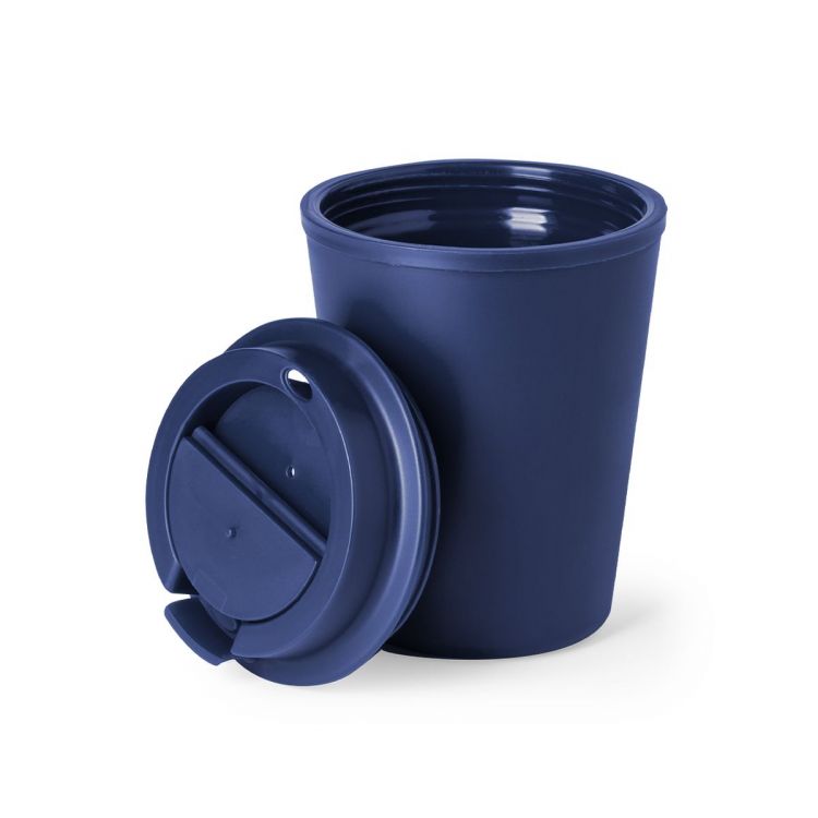 Bicchiere termico da tavolo in PP resistente a doppia parete con capacità di 300 ml di colore opaco. Coperchio con dosatore e apertura facilitata, senza BPA. È ideale per la tua scrivania, tavolo o qualsiasi superficie dove puoi goderti la tua bevanda preferita. Certificato Food Grade, garantisce la sicurezza quando gli alimenti entrano in contatto con il materiale utilizzato per la fabbricazione del prodotto. Il PP riciclato è una plastica riciclata e altamente riciclabile, di grande resistenza e adatta a una moltitudine di applicazioni.