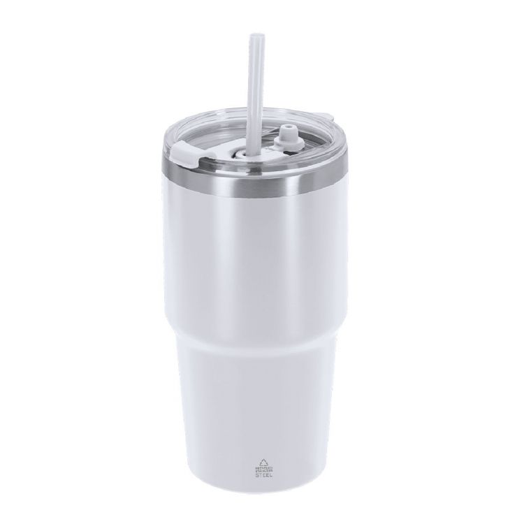 Coppa termica realizzata in acciaio inossidabile riciclato a doppia parete con una capacità di 650 ml. Ha un sistema di bevuta doppio: foro con chiusura ermetica e cannuccia integrata, adattandosi alle preferenze d'uso. Ha un tappo per chiudere ermeticamente quando la cannuccia viene rimossa. È ideale tenerlo sulla scrivania, sul tavolo o su qualsiasi superficie dove puoi gustare tranquillamente la tua bevanda preferita. Con il logo di Acciaio Inox Riciclato.