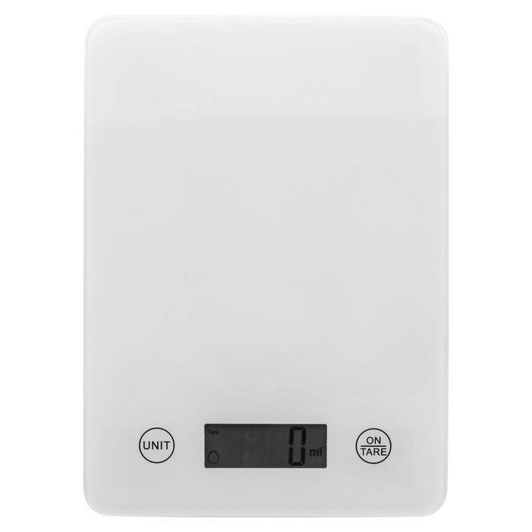 Bilancia da cucina digitale con piattaforma di pesatura in vetro temperato e batteria ricaricabile USB integrata (200 mAh). Capacità: 5 kg, scala di 1 g, unità di misura: g/oz. Con indicatore in ml di acqua/latte. Fornita con cavo di ricarica USB