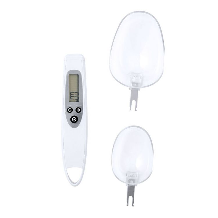 Pratica bilancia digitale con cucchiaio, valida per liquidi e solidi. Include 2 cucchiai intercambiabili e uno schermo digitale LCD situato sul manico, che mostra la pesatura con una precisione di 0,1 g. Pulsante per visualizzare il peso in grammi (g), once (oz), o millilitri (ml), con funzione di memoria e possibilità di pesare due ingredienti. Su entrambi i cucchiai è incisa un'ulteriore scala di misurazione per i liquidi: il cucchiaino da 5 ml a 25 ml; e il cucchiaio grande da 10 ml a 50 ml. Con manuale di istruzioni in spagnolo e inglese. Alimentato da batteria a bottone (inclusa) e presentato singolarmente in una scatola dal design kraft. (colore bianco)