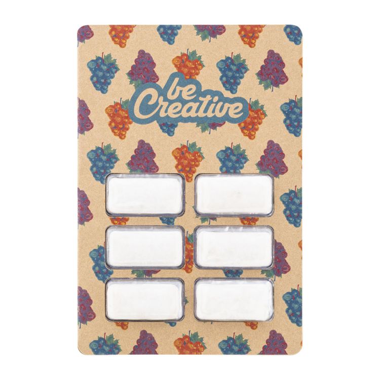 Blister di 6 gomme da masticare senza zucchero con fascetta in cartoncino kraft stampato a colori. MOQ: 100 pezzi