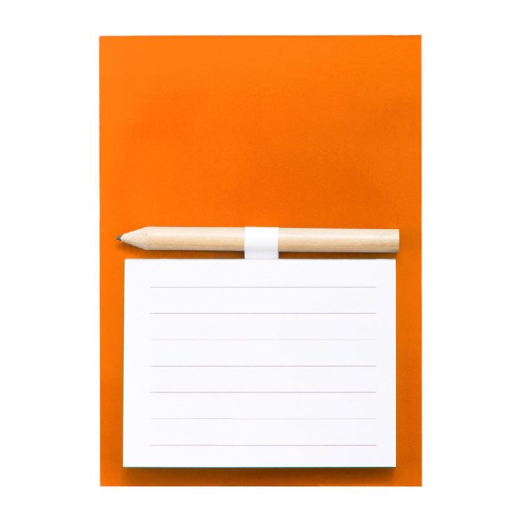 Magnete frigorifero colorato con blocco note da 40 fogli e mini matita in legno.