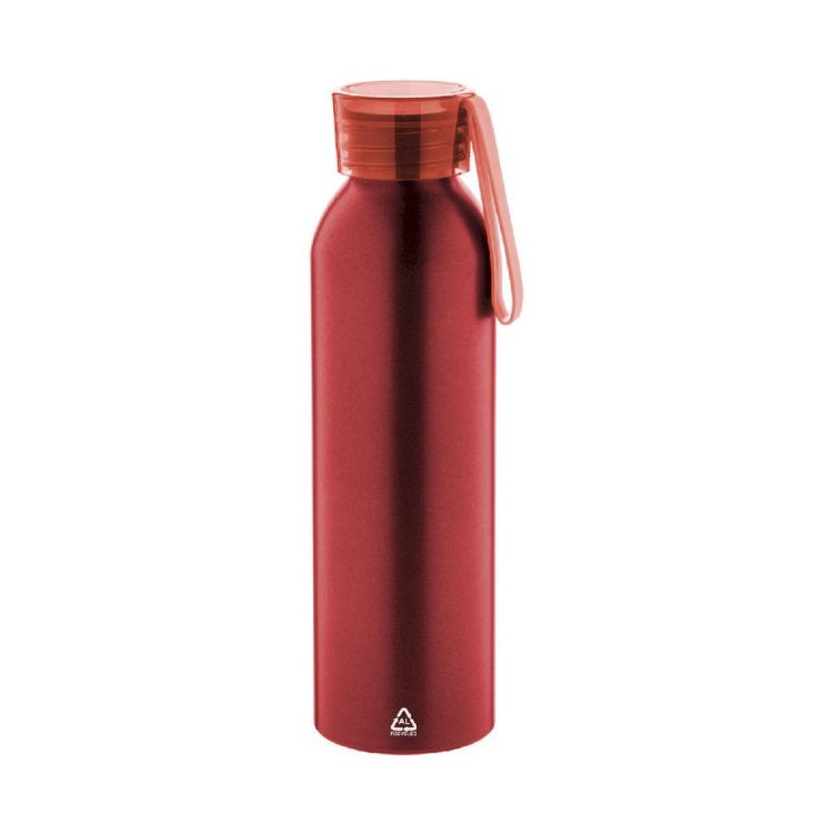 Borraccia da 600ml. in alluminio riciclato con tappo in colore coordinato e laccetto in silicone.