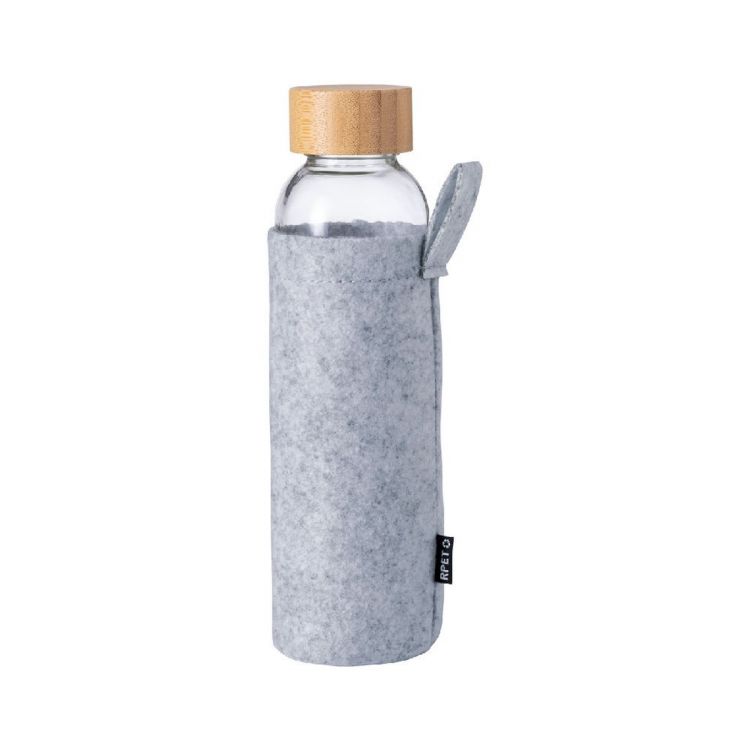 Borraccia in vetro da 500ml. con tappo in bambù e rivestimento in feltro RPET. Non adatta per l'utilizzo con bevande gassate, in colore grigio scuro