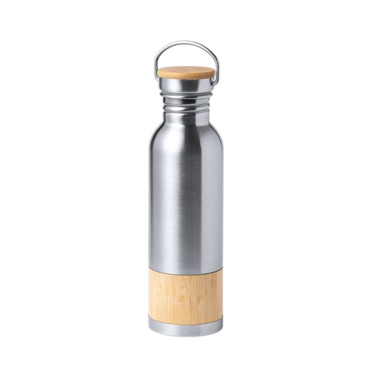 Borraccia dalloriginale stile retrò con capacità di 800 ml. Corpo in acciaio inox con fascia in bambù, coperchio a vite in acciaio inox e dettaglio in bambù. Presentata in una scatola individuale di eco design in cartone kraft. (colore argento)