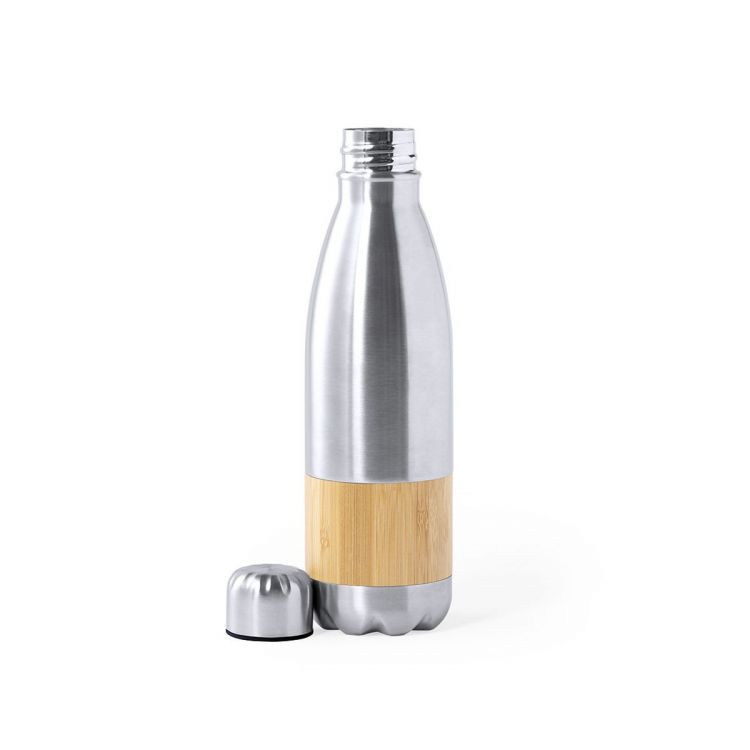 Borraccia della linea Natura, prodotta con una combinazione di acciaio inossidabile opaco e bambù. Capacità di 750ml, con tappo di sicurezza. Confezionata in attraente scatola eco-design. (colore argento)