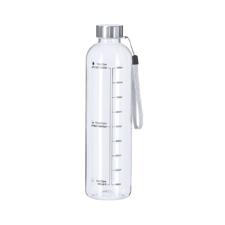 Bottiglia realizzata con RPET da 1L di capacità, progettata per favorire un'idratazione adeguata. Con corpo trasparente. Include indicatore di capacità in litri e once, accompagnato da frasi motivazionali che incoraggiano a mantenere una corretta idratazione quotidiana. Il cappellino, realizzato in acciaio inossidabile, include un cavo pratico per un facile trasporto. Senza BPA. (colore bianco trasparente)