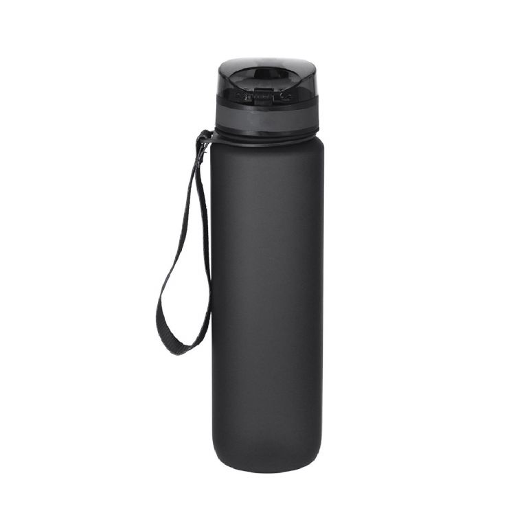 Borraccia da 1L in RPET resistente con finitura opaca traslucida. Con indicatori di capacità in litri e once, insieme a frasi motivazionali per favorire una corretta idratazione. Tappo a vite nero e coperchio in plastica trasparente con chiusura push. Dotata di beccuccio, chiusura di sicurezza e comoda tracolla. BPA-free.