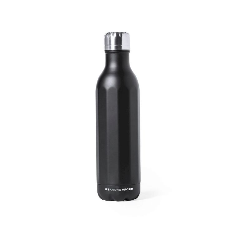 Borraccia in acciaio inossidabile Antonio Miró. Con una capacità di 750 ml e una sobria finitura nera satinata, con corpo a prisma e logo Mirò sulla base. Con tappo a vite cromat. Confezionata in una scatola dal design accattivante con il logo Mirò. (colore nero)