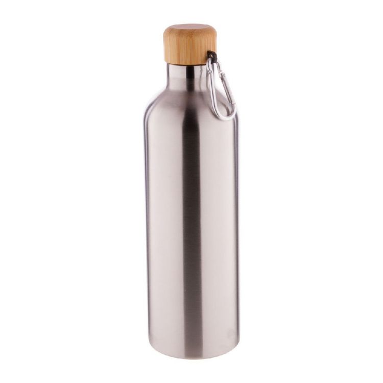 Borraccia termica da 500ml. in acciaio a doppia parete con tappo in bambù e moschettone.