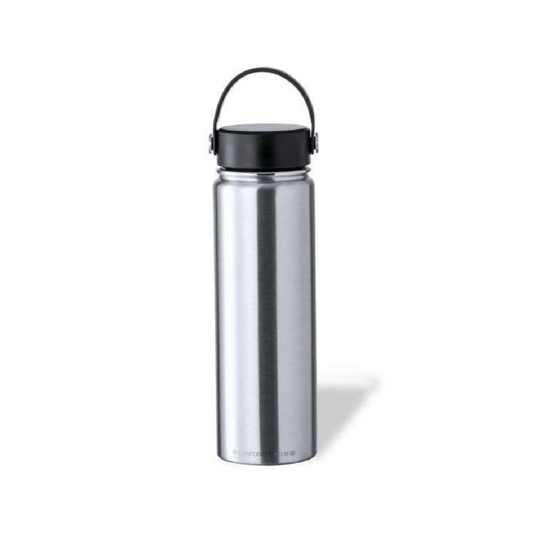 Borraccia termica by Antonio Miró con capacità di 650 ml. Realizzata in acciaio inox a doppia parete con finitura satinata. Con tappo a vite nero e tracolla in silicone abbinata. Con logo Antonio Miró sul corpo e presentata in una scatola nera individuale con logo del marchio.Manuale di istruzioni disponibile in spagnolo e inglese. (colore argento)