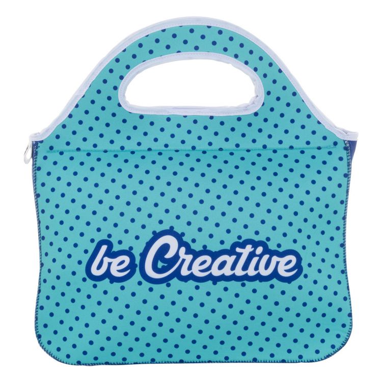Borsa pranzo in neoprene RPET con scomparto chiuso da cerniera, manici ed etichetta RPET. Personalizzabile con grafica stampata in sublimazione. MOQ: 25 pezzi