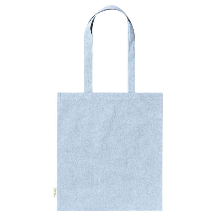 Borsa della spesa riutilizzabile in 100% cotone riciclato da140 g/m² con manici lunghi ed etichetta cotone riciclato.