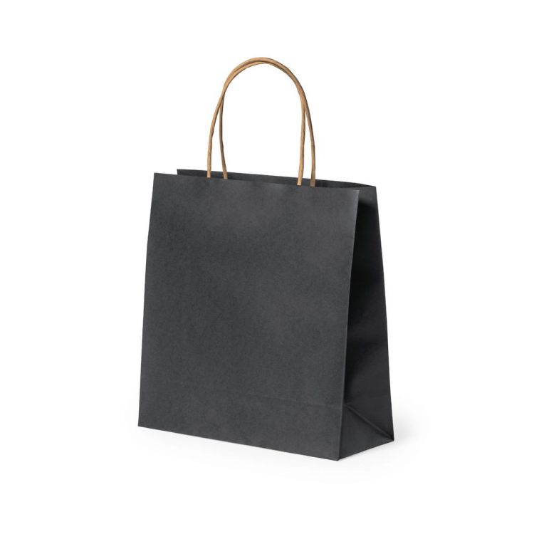 Borsa della linea natura, realizzata in carta riciclata da 100g/m2 rifinita in nero, con manici corti rinforzati in tonalità naturale e soffietto. Resistenza fino a 6 kg di peso. (colore nero)