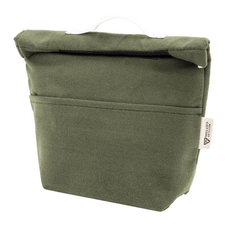 Borsa termica rolltop in tela composta da 70% cotone riciclato e 30% poliestere RPET, con tasca frontale, imbottitura in alluminio, chiusura in velcro ed etichetta cotone riciclato.