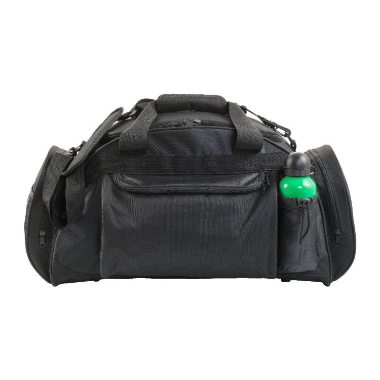 Borsone sportivo/viaggio, ampio scomparto centrale, tasca anteriore con chiusura lampo, vani laterali per bottiglia e cuffia, in poliestere 600 D, in colore nero
