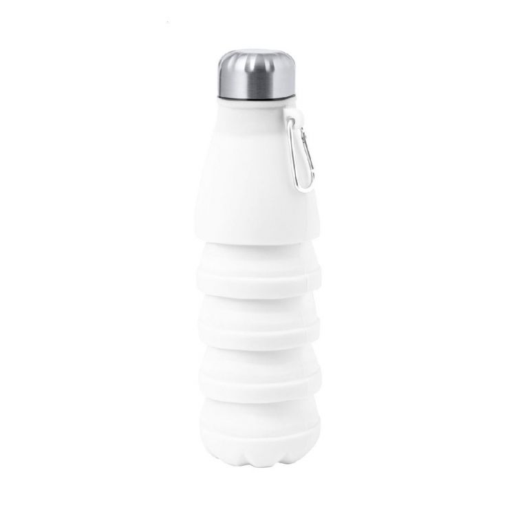 Bottiglia sportiva pieghevole in silicone con coperchio in acciaio inox e moschettone. 550 ml, in colore bianco