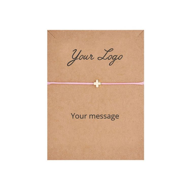 Braccialetto colorato in corda sottile e charm in metallo (nichel free). Il braccialetto viene fornito insieme ad un cartoncino riciclato personalizzabile da un lato con il proprio messaggio di comunicazione. Confezionato singolarmente in polybag trasparente.