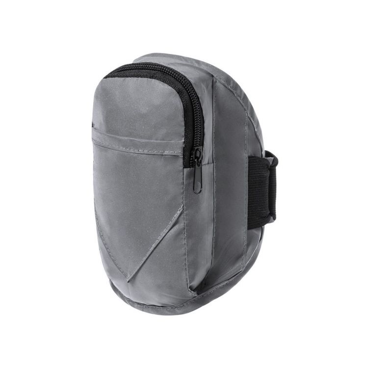 Bracciale sportivo in poliestere 210T, realizzato con un tessuto ad elevata capacità riflettente, grazie a milioni di pigmenti riflettenti e basato sul principio della retro-riflessione, una proprietà della visibilità notturna che consiste nella rifrazione della luce verso la fonte della luce stessa. Tasca principale con zip e tasca frontale con chiusura in velcro. Con cinturino elastico regolabile e resistente all'acqua (colore grigio)