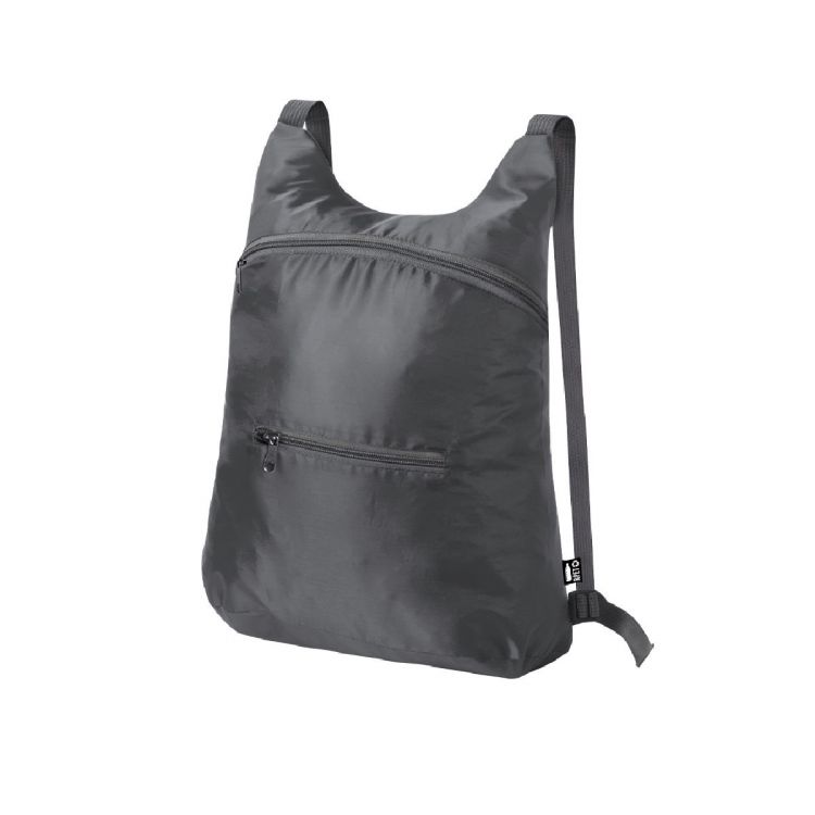 Zaino pieghevole in morbido poliestere 201D RPET, realizzato in plastica riciclata, per promuovere il riutilizzo dei rifiuti plastici e aiutare la sostenibilità del pianeta. Con chiusura a zip e tasca frontale. Angoli rinforzati, spallacci regolabili e accessori grigi. Pieghevole in piccolo formato , con cinghia di trasporto e disponibile in una vasta gamma di colori. Distintivo RPET sull'etichetta.