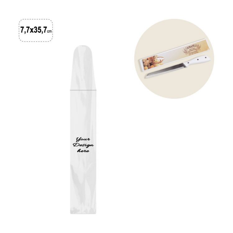 Bustina lunga realizzata in PVC trasparente con apertura sul lato corto per l'inserimento di interni cartacei, richiudibile con la pattella.