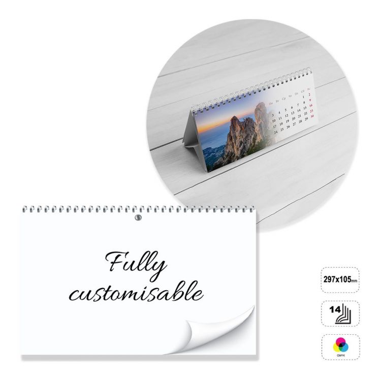 Calendario da tavolo orizzontale, totalmente personalizzabile. Il prodotto è composto da 14 fogli di carta patinata opaca da 135 grammi stampabili fronte o fronte e retro in quadricromia. Rilegato con la spirale metallica color argento, bianco o nero, posizionata in cima. Supporto in cartoncino bianco da 300 gr non stampabile. Il calendario può essere personalizzato basandosi sul template modificabile fornito, oppure costruito completamente seguendo le linee guida fornite.