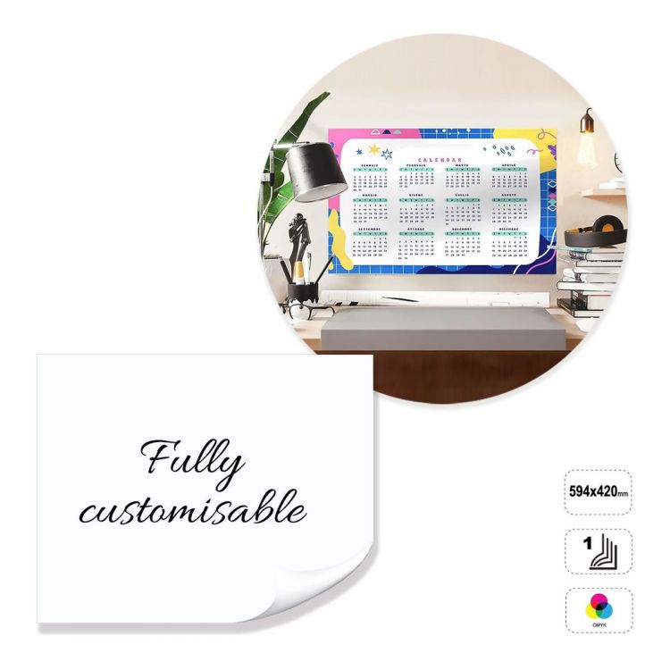 Calendario poster orizzontale, totalmente personalizzabile. Il prodotto è realizzato con carta patinata opaca da 350 grammi stampabile sul fronte in quadricromia. Disponibile la plastificazione sul fronte a scelta tra lucida, opaca o soft touch. Il calendario può essere personalizzato basandosi sul template modificabile fornito, oppure costruito completamente seguendo le linee guida fornite.