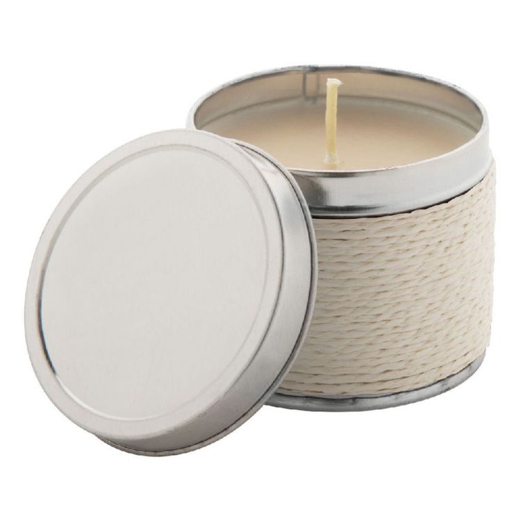 Candela profumata in scatola di latta decorata con dello spago.