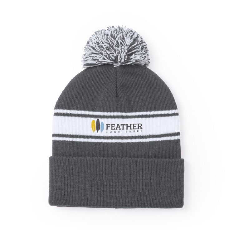 Caldo e morbido berretto in materiale acrilico in una varietà di colori. Design originale, con striscia frontale bianca e pom pom bicolore abbinato.