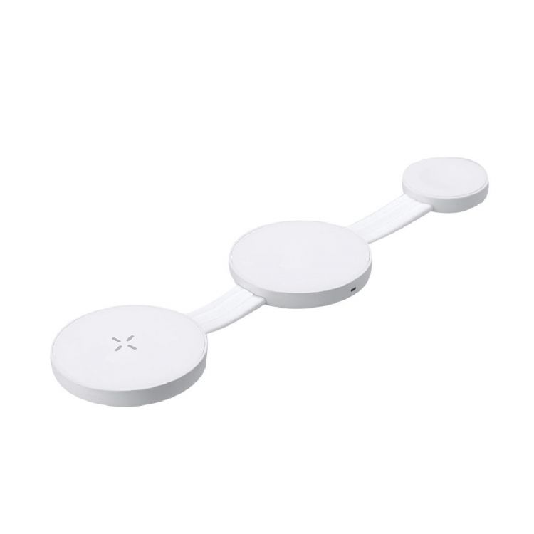 Caricatore wireless magnetico da 15W da 3 in 1, realizzato in ABS. Progettato per la ricarica simultanea di smartphone, cuffie e smartwatch, ed è ultra-compatto per dimensioni. Un gadget tutto-in-uno: pieghevole, portatile, altamente versatile e progettato funzionalmente. Connessione USB di tipo C -cavo incluso-.