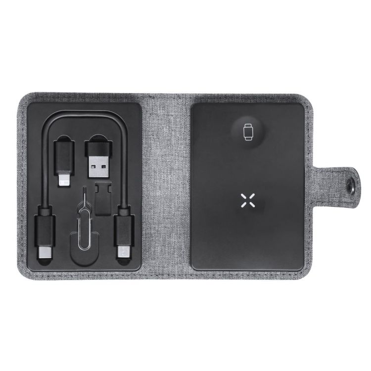 Base di ricarica completa realizzata in 300D RPET. Custodia compatta con chiusura a bottone e dock di ricarica wireless Qi per smartphone, auricolari e smartwatch. Fornito con cavo di connessione Type-C ad entrambe le estremità, più adattatori USB e lightning/micro USB. Il set è completato da un estrattore di schede SIM e un vano per riporre una scheda Micro SIM. Con logo RPET.Il materiale RPET è realizzato in plastica riciclata, promuovendo così il riutilizzo dei rifiuti di plastica e contribuendo alla sostenibilità del pianeta. (colore grigio)