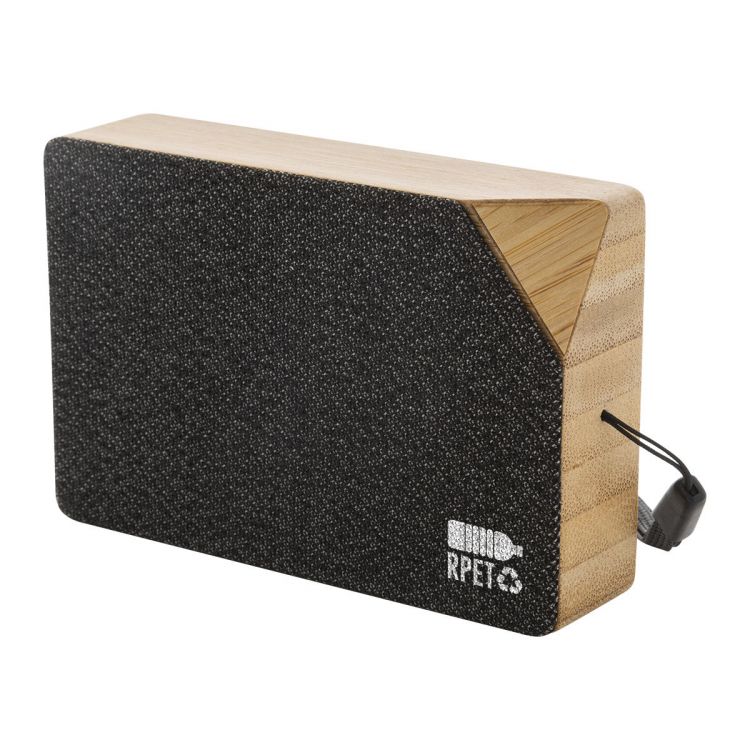 Cassa wireless in bambù con tessuto in poliestere RPET, caricatore solare integrato e batteria ricaricabile (300 mAh). Cavo di ricarica USB Incluso