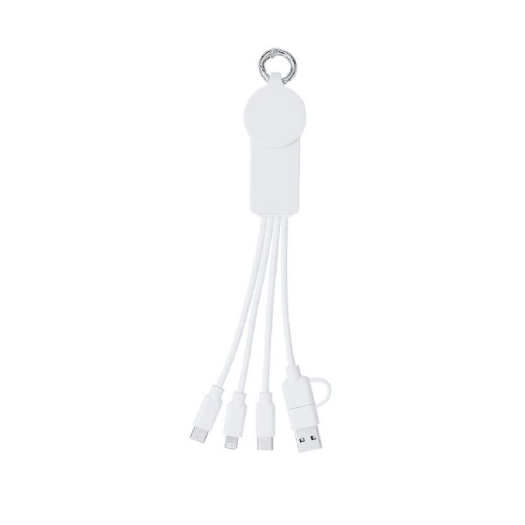 Cavo caricatore 5 in 1. Include connessioni di ricarica wireless per smartwatch (Android e iOS), connessioni di ingresso Tipo C e USB e di uscita Tipo C e doppio connettore micro USB e Lightning. (colore bianco)