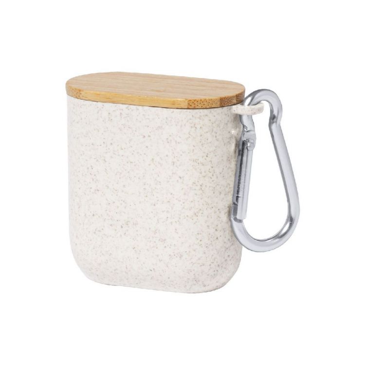 Cavo di ricarica USB in astuccio di plastica ecologica in paglia di grano con moschettone e coperchio portacellulare in bambù. Con connettori micro USB, USB-C, Lightning ed ingressi USB e USB-C, in colore naturale