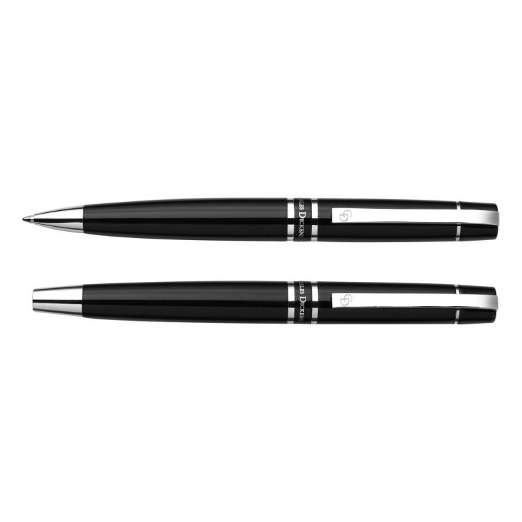 Charles Dickens®, set scrittura in metallo, finiture cromate, con penna a sfera e rollerball, meccanismo a rotazione, refill nero, elegante astuccio in PU, in colore nero