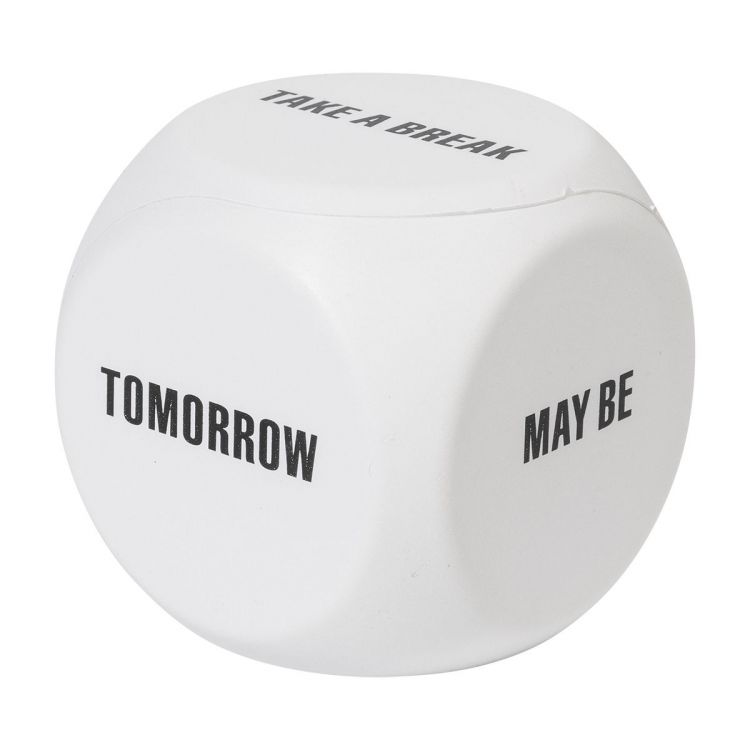 Antistress a forma di dado in schiuma di poliuretano. Presenta i seguenti messaggi: "Fai una pausa", "Domani", "Forse", "Sì", "No" e un lato disponibile per la stampa del logo, in colore bianco