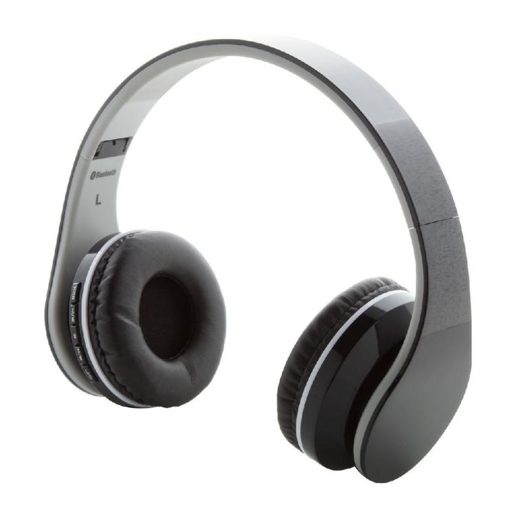 Cuffie wireless pieghevoli in plastica con batteria ricaricabile integrata. Con funzioni di chiamata in vivavoce e riproduzione di MP3 su micro SD. Cavi di ricarica USB e jack audio da 3,5 mm inclusi.