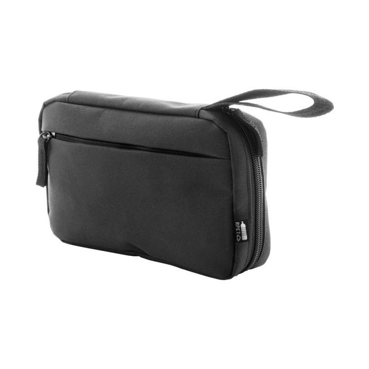 Custodia organizer per cavetteria in poliestere 600D RPET, scomparti interni in rete, tasca frontale chiusa da cerniera ed etichetta RPET.
