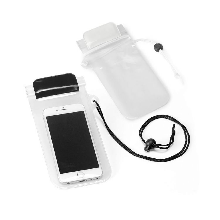 Porta cellulare waterproof tattile in PVC con tracolla regolabile. Parte frontale trasparente e posteriore bianco opaco trasparente e quella posteriore è bianco opaco. La borsa ha chiusura ermetica