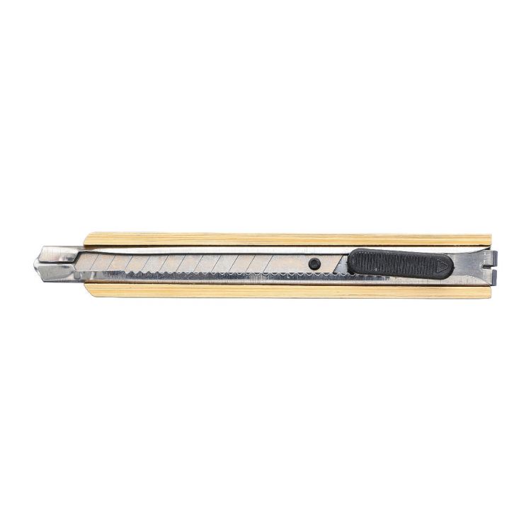 Cutter in metallo con corpo in bambù e le lame in acciaio al carbonio, presenta clip in metallo sul retro per fissare la lama quando non viene utilizzata, confezionato singolarmente in sacchetto di plastica riciclata, in colore marrone