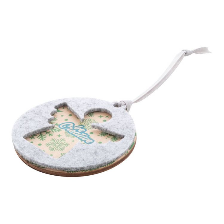 Ornamento per albero di Natale in feltro RPET a doppio strato e compensato di betulla, con nastro argentato e disegno natalizio fustellato sullo strato superiore. Il costo comprende la stampa a LED UV sullo strato inferiore. MOQ: 100 pezzi